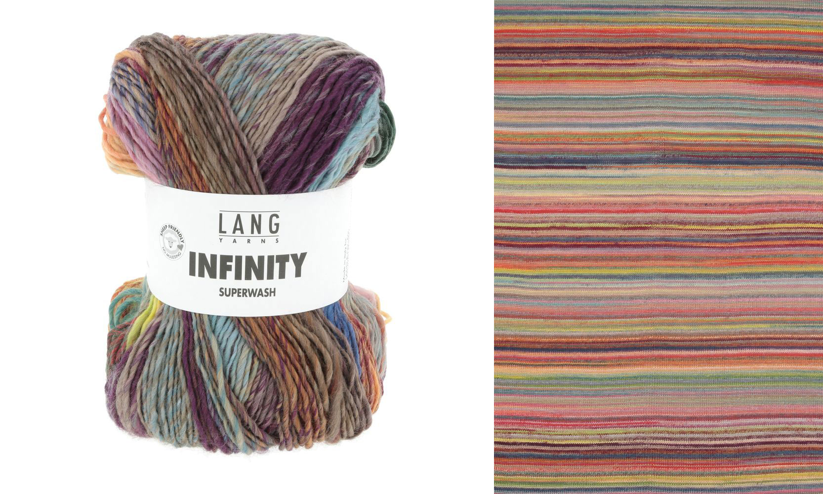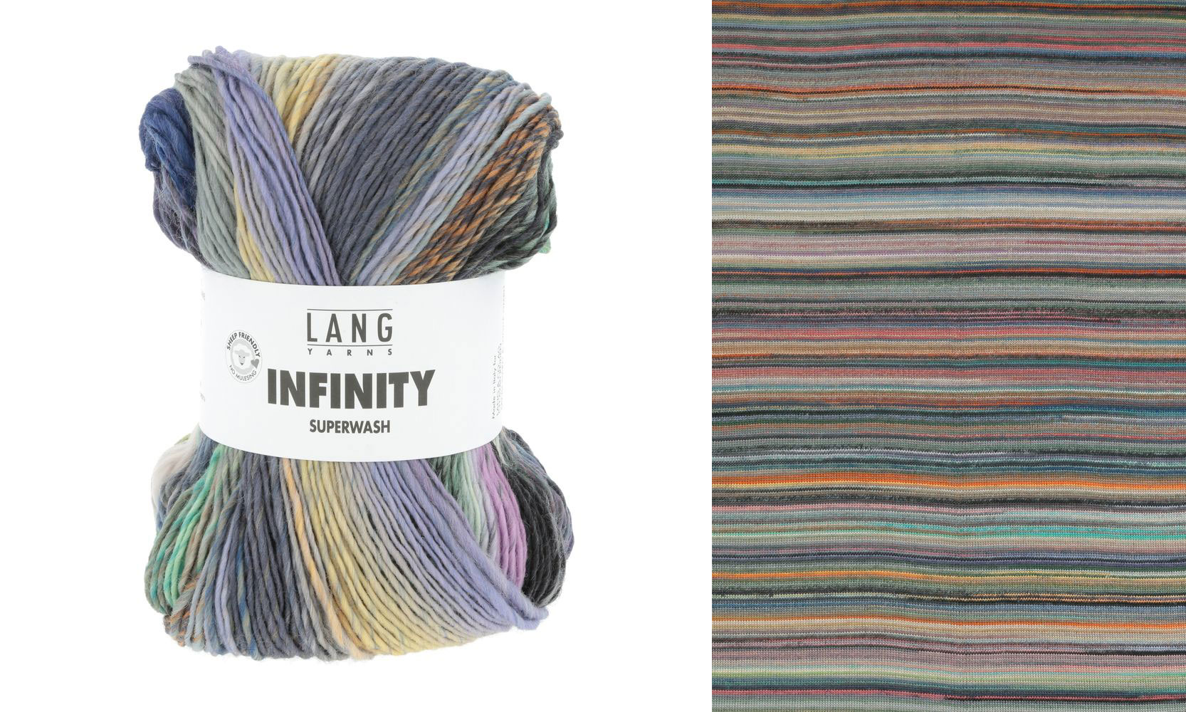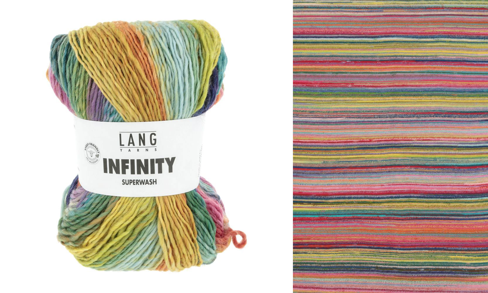 Lang Yarns Infinity, qui est aussi très bien adapté pour les accessoires, développe tout son potentiel dans de plus gros projets comme des vêtements ou des couvertures, là où les coloris créent un effet visuel impressionnant.