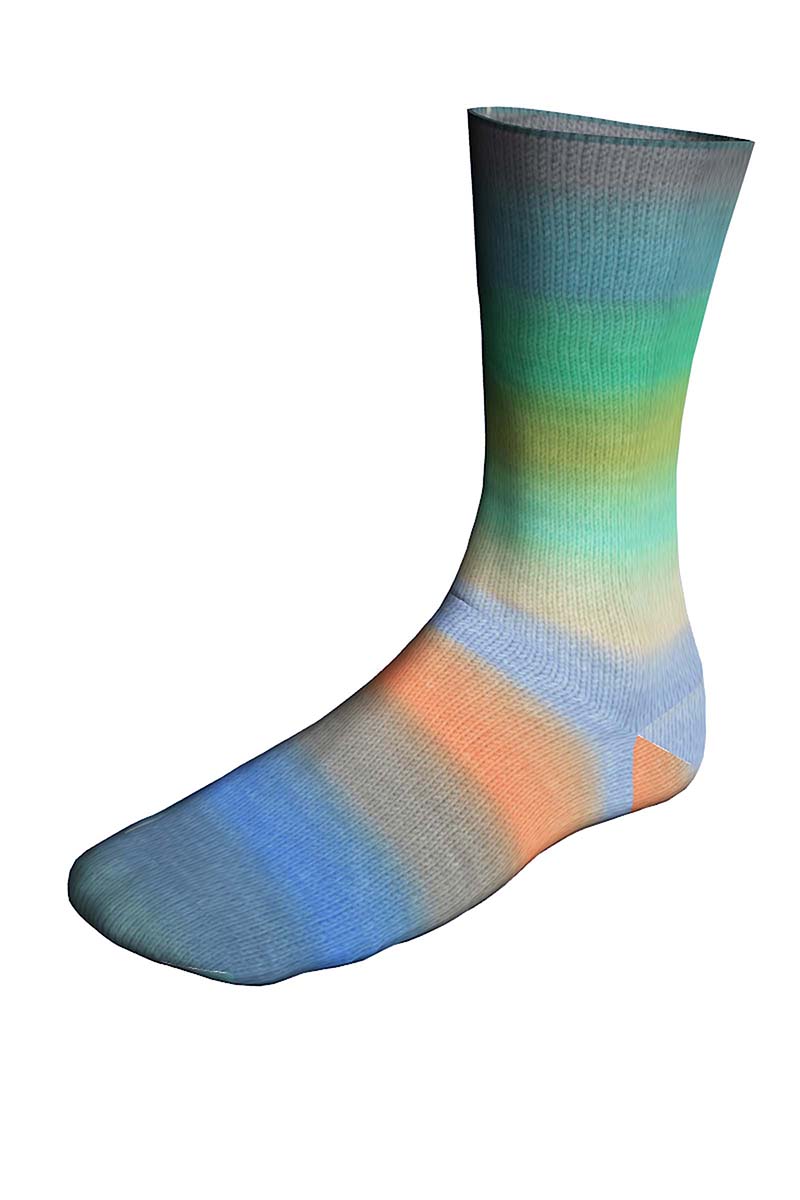 Les chaussettes jumelles avec deux dégradés de couleurs identiques dans une pelote. Commencez la première chaussette en prenant le fil par l‘intérieur de la pelote. Au bout de 200 m, vous trouverez une partie de fil non teintée. Coupez cette partie de fil. C‘est juste après que commence le même dégradé de couleurs pour la seconde chaussette. Bon travaux d‘aiguilles avec vos TWIN SOCKS !