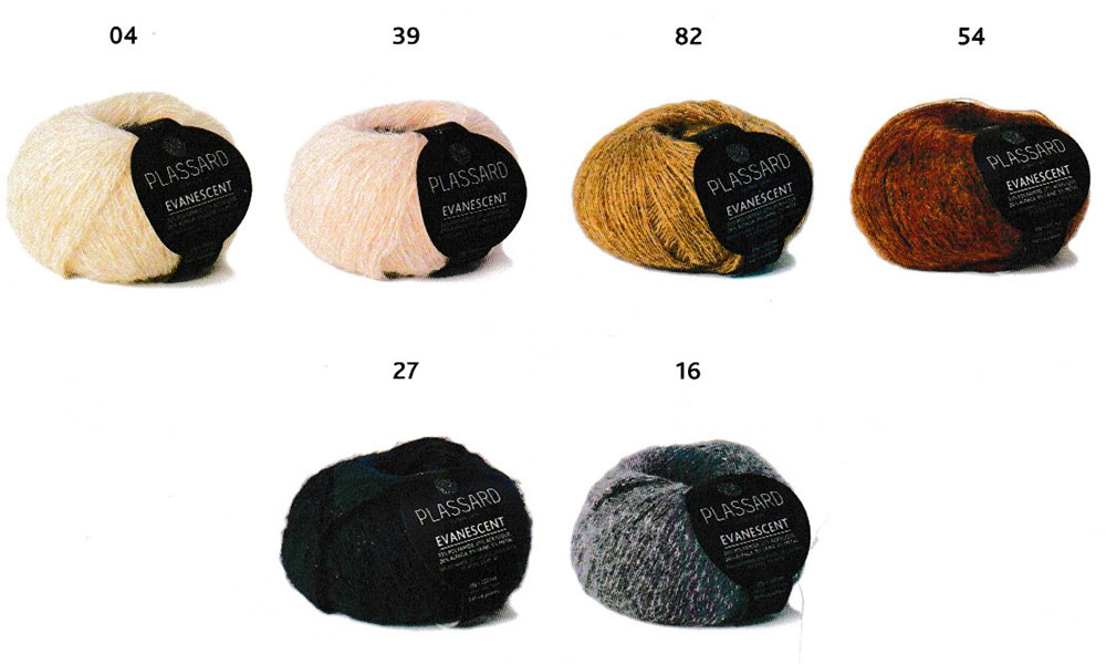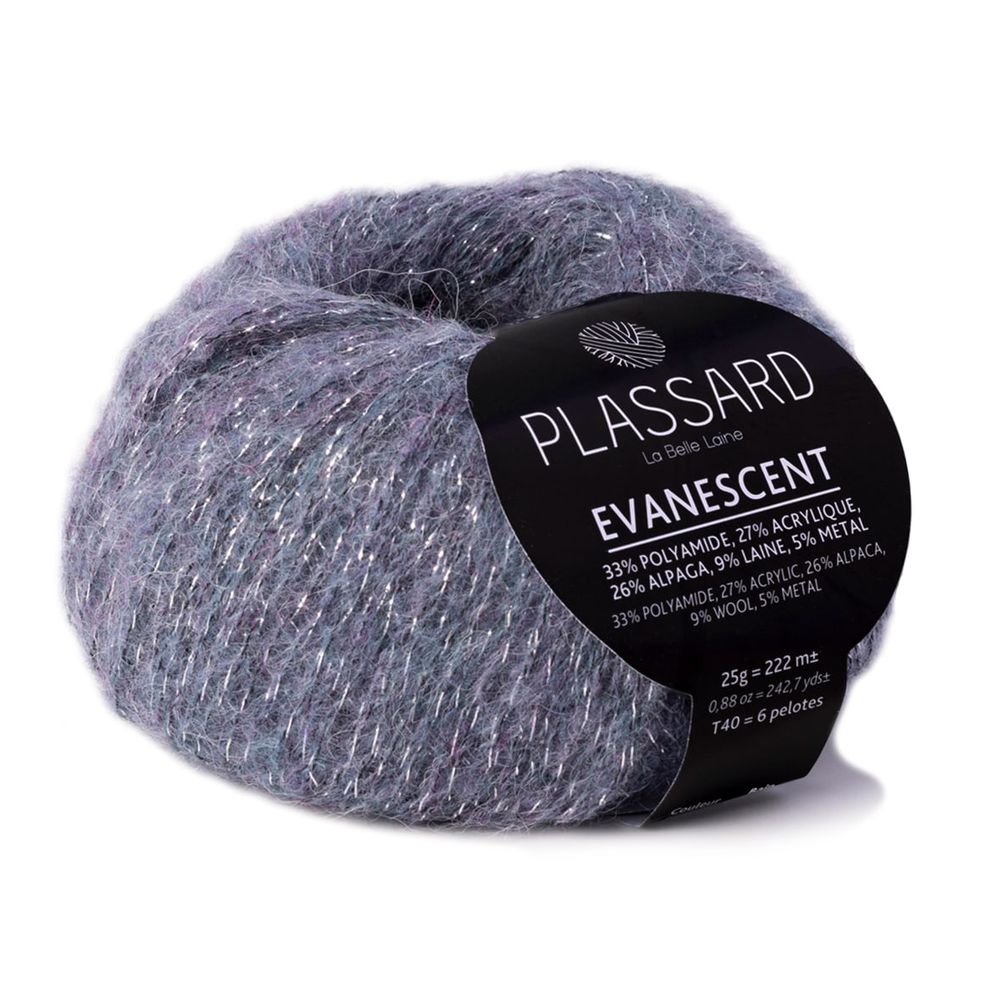 Plassard Evanescent est un fil lace à la fois léger et poétique composé d’alpaga (26%), de laine (9%), de polyamide (33%) et d’acrylique (27%) le tout agrémenté d’un fil métallisé (5%). Il est proposé en pelotes de 25 gr pour 222 m et décliné dans une gamme de 6 nuances allant du nude au bleu acier en passant par le cuivre et le camel.