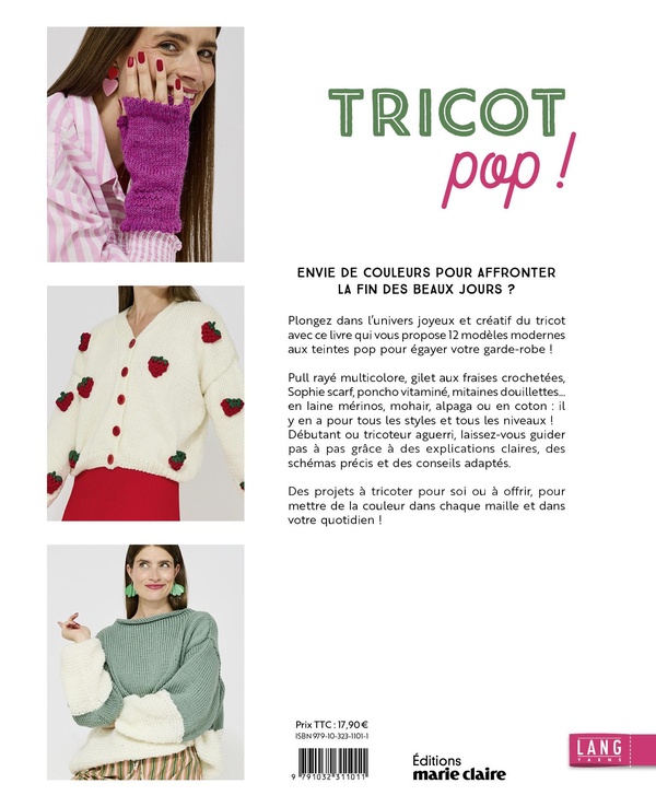 Auteur : Annick Michalon Editeur : Marie Claire Nombre de pages : 96 Parution : octobre 2025 Le livre Tricot Pop d’Annick Michalon est une véritable ode à la créativité. Il propose 12 modèles modernes et colorés, accessibles aux débutants comme aux tricoteurs confirmés. Modèles pétillants et modernes pour dynamiser votre garde‑robe Explications claires et illustrées pour réussir chaque projet Adapté à différents fils de Lang Yarns Idéal pour offrir ou se lancer dans le tricot créatif Descriptif